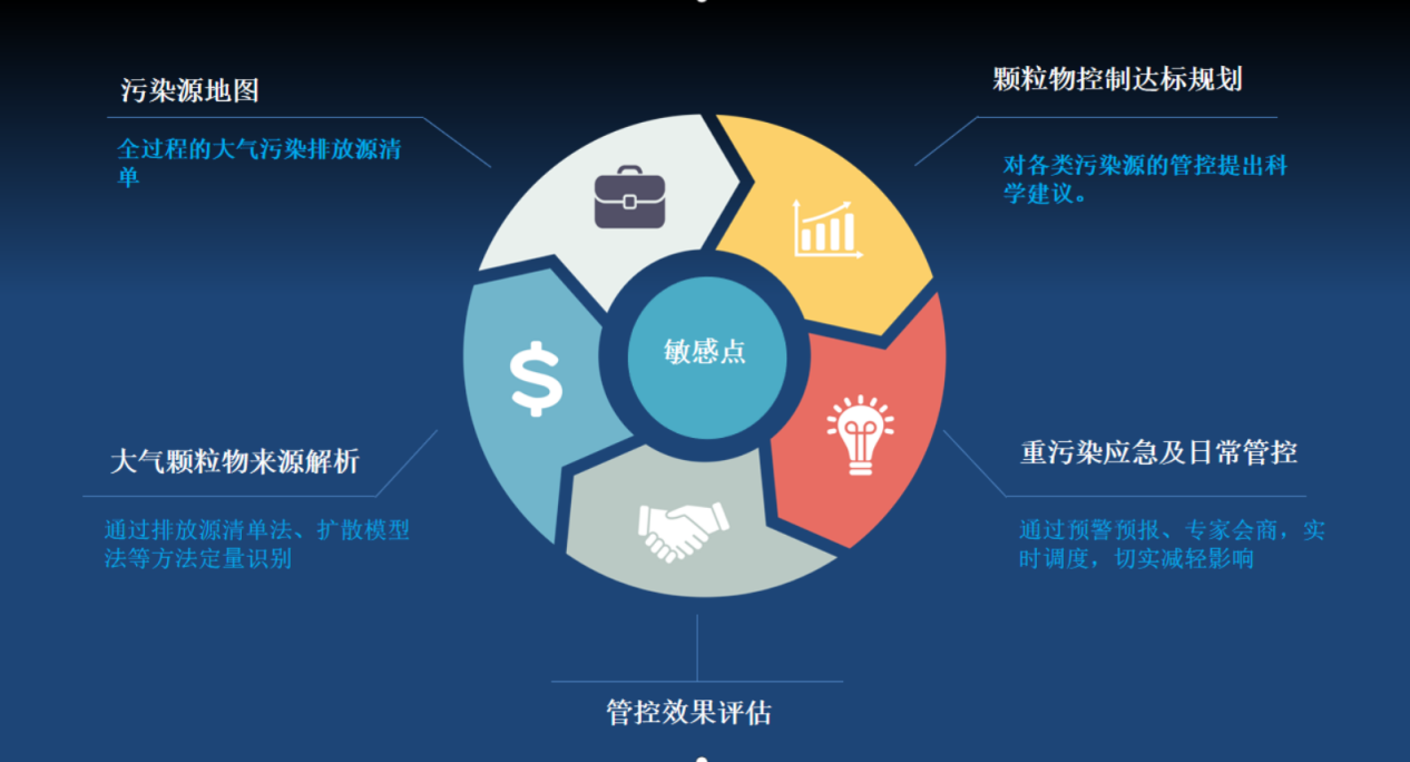 通过对监测点位周边调研、测试,形成全过程大气污染排放清单(污染地图),耦合运用排放源清单法、扩散模型法等多种方法形成大气颗粒物来源解析结果;结合城市空气质量现状、改善目标、污染源减排潜力等制定不同的减排方案,并评估情景效果,形成颗粒物控制达标规划及精准治理方案。