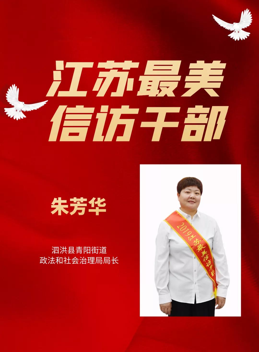 朱芳华,泗洪县青阳街道政法和社会治理局局长。工作30年来,她坚持扎根基层一线,把青春和对党的忠诚毫无保留地献给了基层事业,在不同岗位上取得不凡的业绩。她创新思路,总结经验探索化解信访矛盾“1+3”工作法,坚定“信访问题非信访化解决”,推动信访矛盾纠纷多元化解,为助力泗洪经济社会和谐稳定贡献了力量。